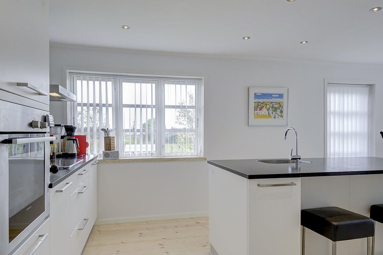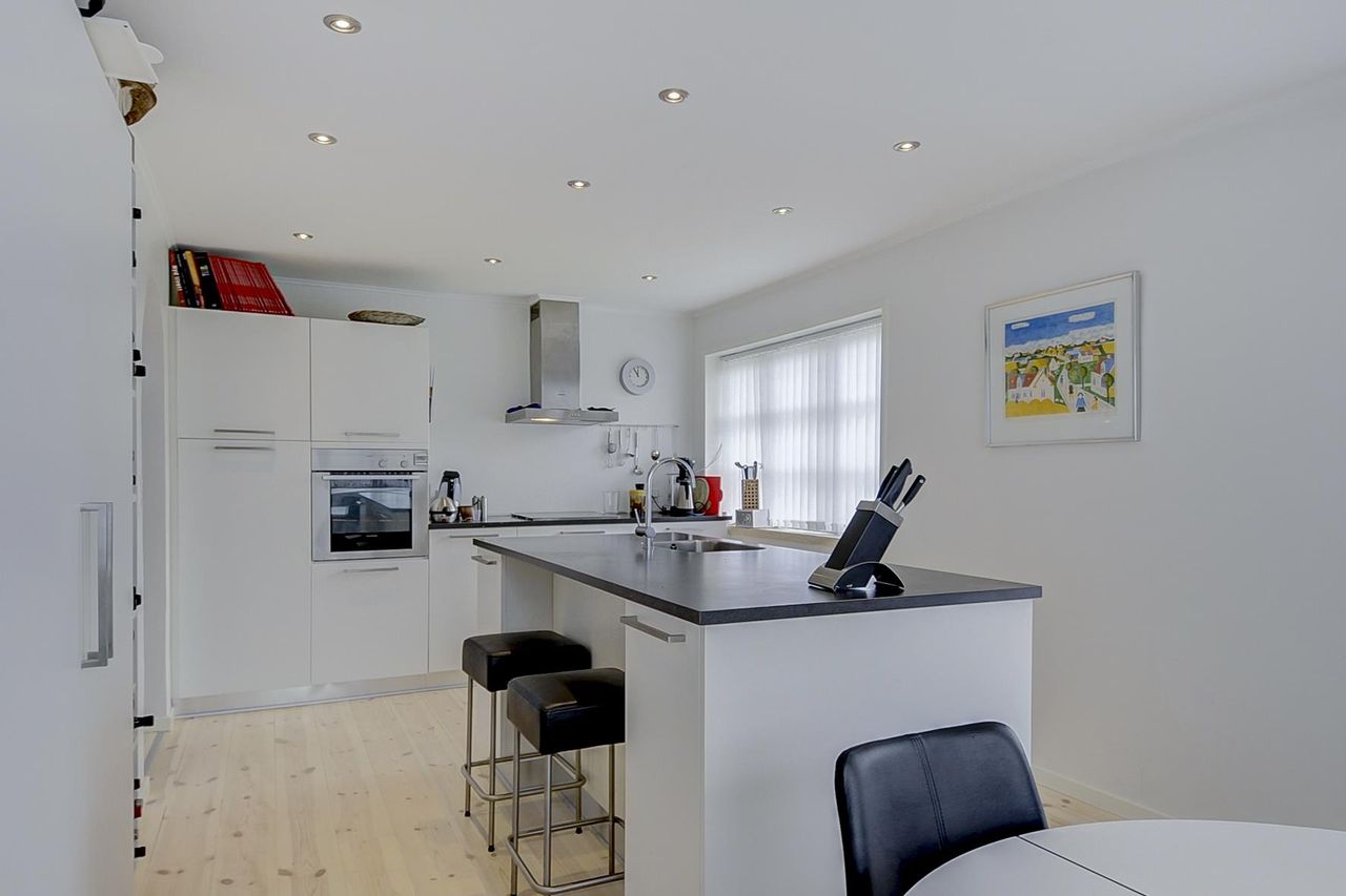 - Stort køkken/alrum med hvide elementer, trægulv og udgang til træterrasse.