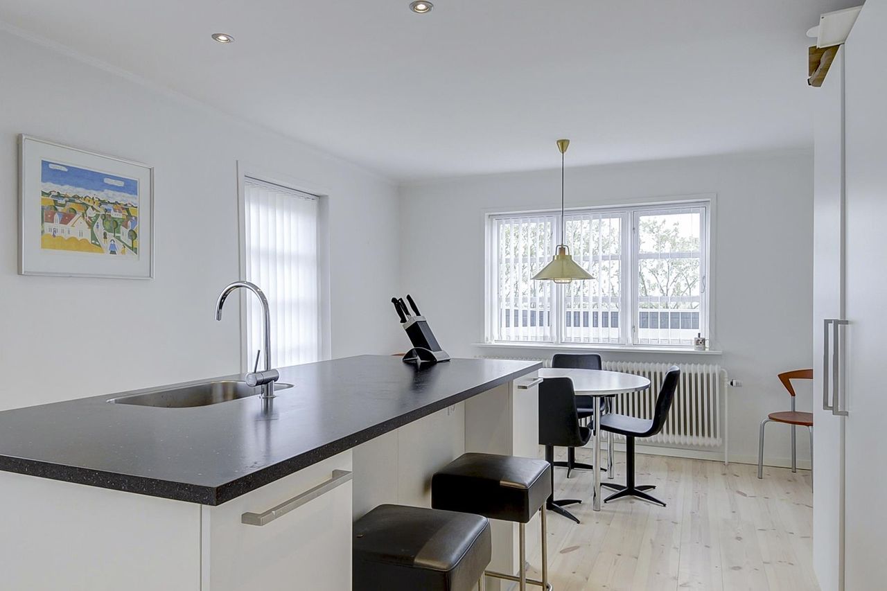 - Stort køkken/alrum med hvide elementer, trægulv og udgang til træterrasse.